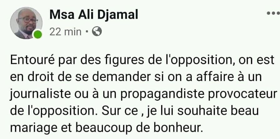 Or, pendant que les Comoriens aimant sincèrement leur pays se réjouissent du mariage de leur frère Oubeidi Mchangama Athoumani, l’une des créatures les plus méprisables et méprisées, haïssables et haïes, détestables, détestées et exécrables des Comores, Msa Ali Djamal, en l’occurrence, jaloux de la réussite du jeune prodige, exprime publiquement sa jalousie haineuse pour n’avoir pas été invité à cette mémorable cérémonie au cours de laquelle plusieurs acteurs politiques et de prestigieux notables étaient présents pour exprimer la gratitude de la patrie et du peuple. Voici le cri de haine poussé par le mendiant Msa Ali Djamal contre Oubeidi Mchangama Athoumani, qui défend son peuple et sa patrie: «Entouré par des figures de l’opposition, on est en droit de se demander si on a affaire à un journaliste ou à un propagandiste provocateur de l’opposition. Sur ce, je lui souhaite beau mariage et beaucoup de bonheur». Comme on se moque des vœux de cet hypocrite irresponsable!